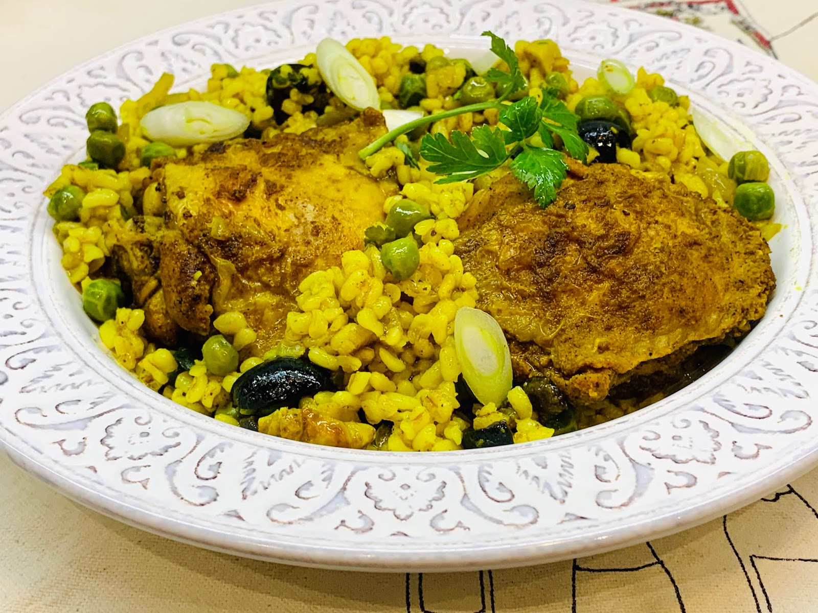 Kuřecí maso osolte. V misce smíchejte kurkumu a koření Garam Masala. V polovině této směsi obalte maso. Cibuli pokrájejte najemno a česnek na plátky, kousek zázvoru oloupejte a nastrouhejte. Koriandr nebo petrželku posekejte nadrobno. Olivy můžete nechat buď vcelku nebo je pokrájet na polovinu. Rozehřejte 1 lžíci oleje ve spodní části Tajinu nebo ve velkém litinovém hrnci a cca 10 minut na něm smažte kuřecí maso kůží dolů. Otočte a osmažte i druhou stranu nyní už stačí 2-3 minuty. Vyjměte pomocí vidličky maso z hrnce a odložte ho stranou. Do hrnce vlijte druhou lžíci oleje a osmahněte na něm cibuli a česnek dozlatova. Nyní vsypte zbylou část směsi koření, nastrouhaný zázvor a ještě cca 1 minutu míchejte. Zalijte vývarem, přihoďte olivy a přiveďte k varu. Snižte teplotu a vraťte do hrnce maso. Zakryjte horní částí Tajinu nebo pokud vaříte v hrnci zakryjte ho poklicí a nechte vařit cca 40 minut. Po uplynutí času maso vyjměte a udržujte ho v teple. Do vývaru vsypte bulgur. Držte se návodu na obalu, bulgur je třeba předem propláchnout vodou. Zakápněte šťávou z limety. Pokud máte málo šťávy v hrnci přidejte vroucí vodu tak aby byl bulgur zcela zalitý tekutinou. Přiklopte poklicí a vařte cca 5 minut. Nyní přidejte hrášek a vařte dalších 5 minut. Bulgur by měl do sebe vsáknout většinu tekutiny. Vypněte hořák a přidejte posekané bylinky dle Vaší volby. Nakonec položte navrch kousky kuřete.